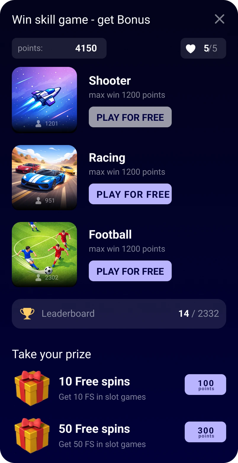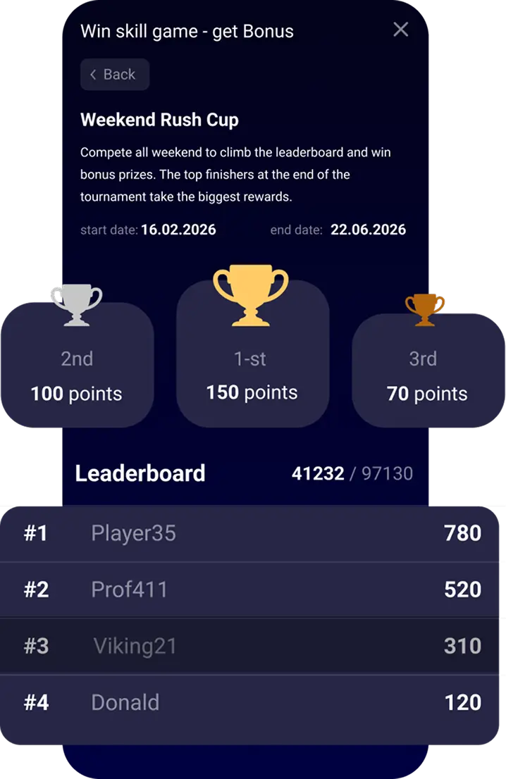 A lightweight mini‑lobby gives you a single entry point where players join skill-based tournaments, track leaderboards, earn points, and redeem rewards. It can be placed anywhere on your site.